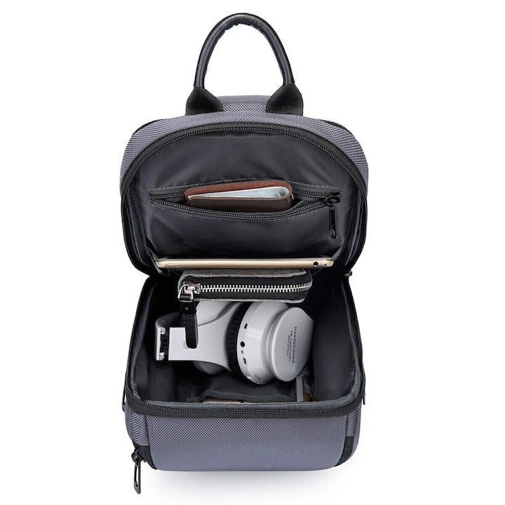 Designed for convenience. The BANGE Sling backpack has a large main compartment with multiple inner pockets. Perfect for carrying a 9.7-inch iPad, camera, notebook, pens, power bank, and even a small water bottle. A front side pocket allows quick access to smaller items, while the exclusive card pocket on the shoulder strap adds thoughtful functionality for travel or hanging around.